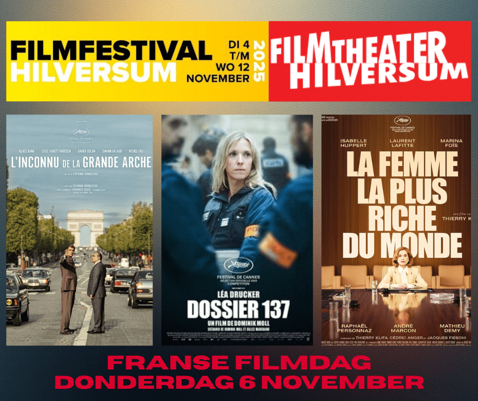 Op donderdag 6 november 2025 organiseert het Filmtheater tijdens het Filmfestival Hilversum de Franse Filmdag: een compleet filmarrangement met drie bijzondere Franse films, een lunchpakket en een consumptie in de lunchpauze.