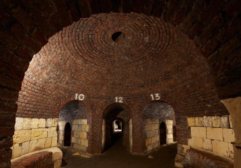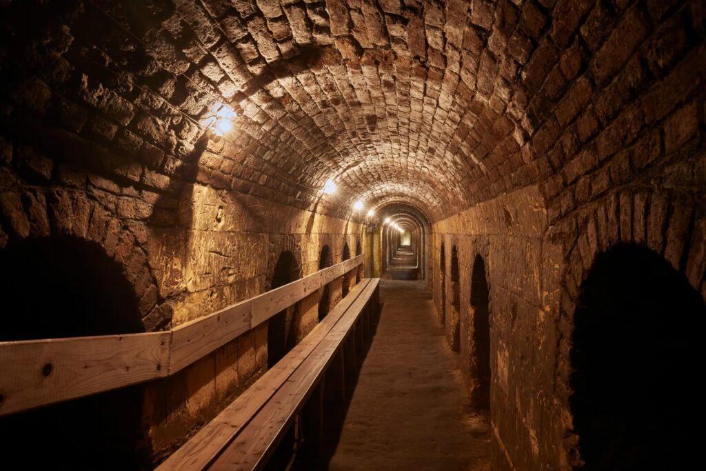 We maken een wandeling door de bakstenen tunnels waar de kruispunten allemaal op elkaar lijken en voor verwarring zorgen. Ook bezoeken we een expositie waarin twee schuilperiodes worden belicht, die van de Tweede Wereldoorlog en de Koude Oorlog. Foto’s, originele affiches en installaties schetsen een goed sfeerbeeld  dat terugvoert naar deze vaak angstige en beklemmende tijd, die zo nu en dan ook een glimlach zal oproepen en tot nadenken stemt.
