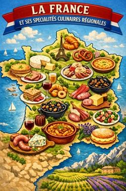 Candice Valero présente l’importance de la gastronomie dans la culture francaise (qu’est-ce que la gastronomie, l’importance des repas en France) puis les specialités régionales sucrées et salées (leurs origines, les recettes, comment les déguster).