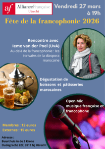 À 19h, nous aurons l’honneur d’accueillir Ieme van der Poel, professeure émérite de l’Université d’Amsterdam, qui nous parlera de la littérature francophone de la diaspora marocaine et proposera un parallèle avec la littérature néerlandophone marocaine.