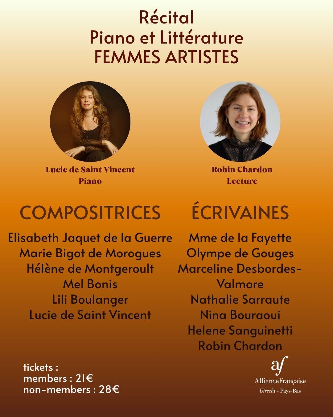 Programme de femmes artistes, compositrices et écrivaines, mises en valeur par ce concert sur mesure créé par Lucie de Saint Vincent et Robin Chardon, spécialement pour l'Alliance Française Utrecht.
